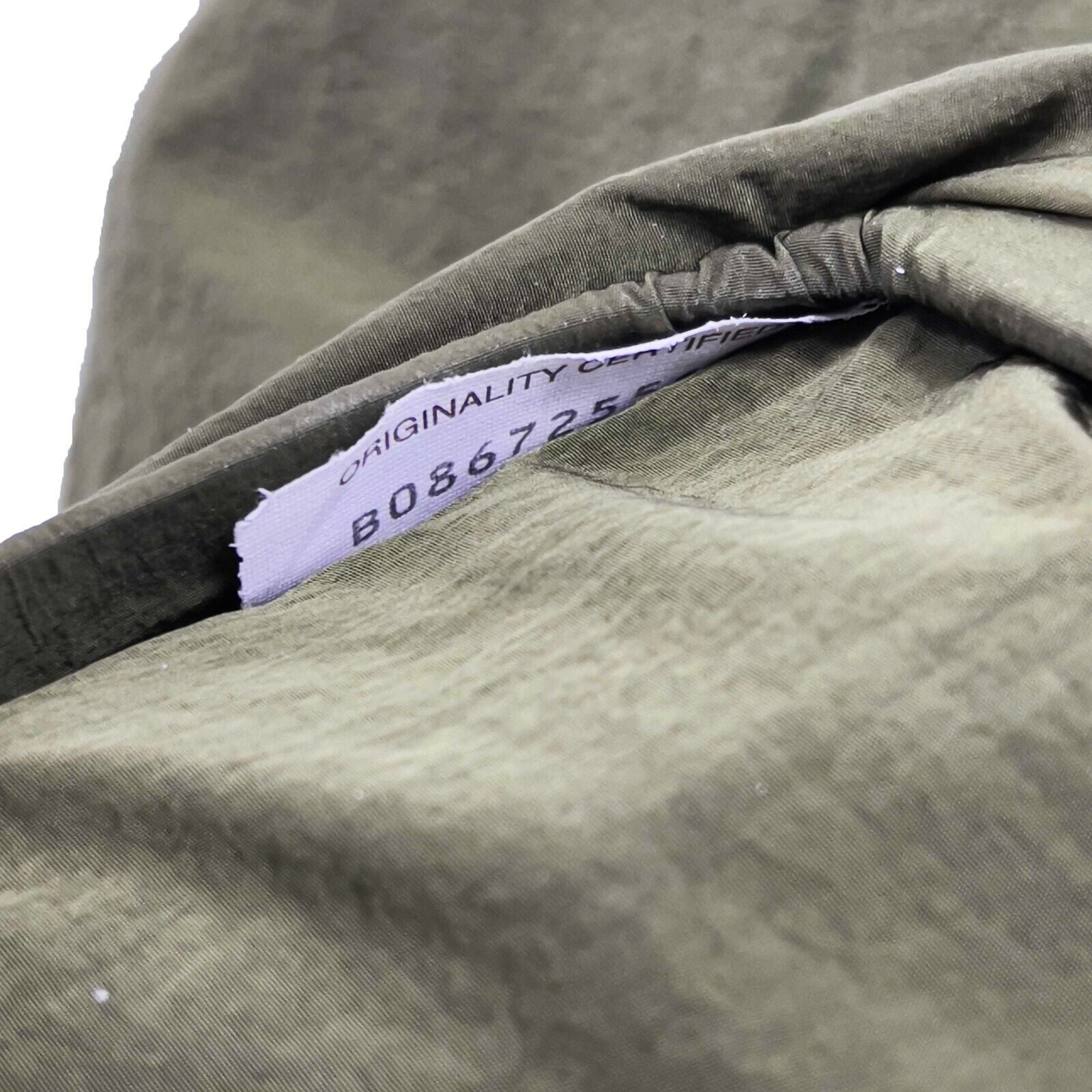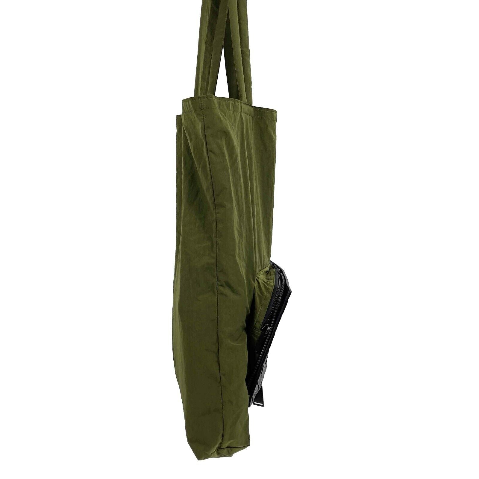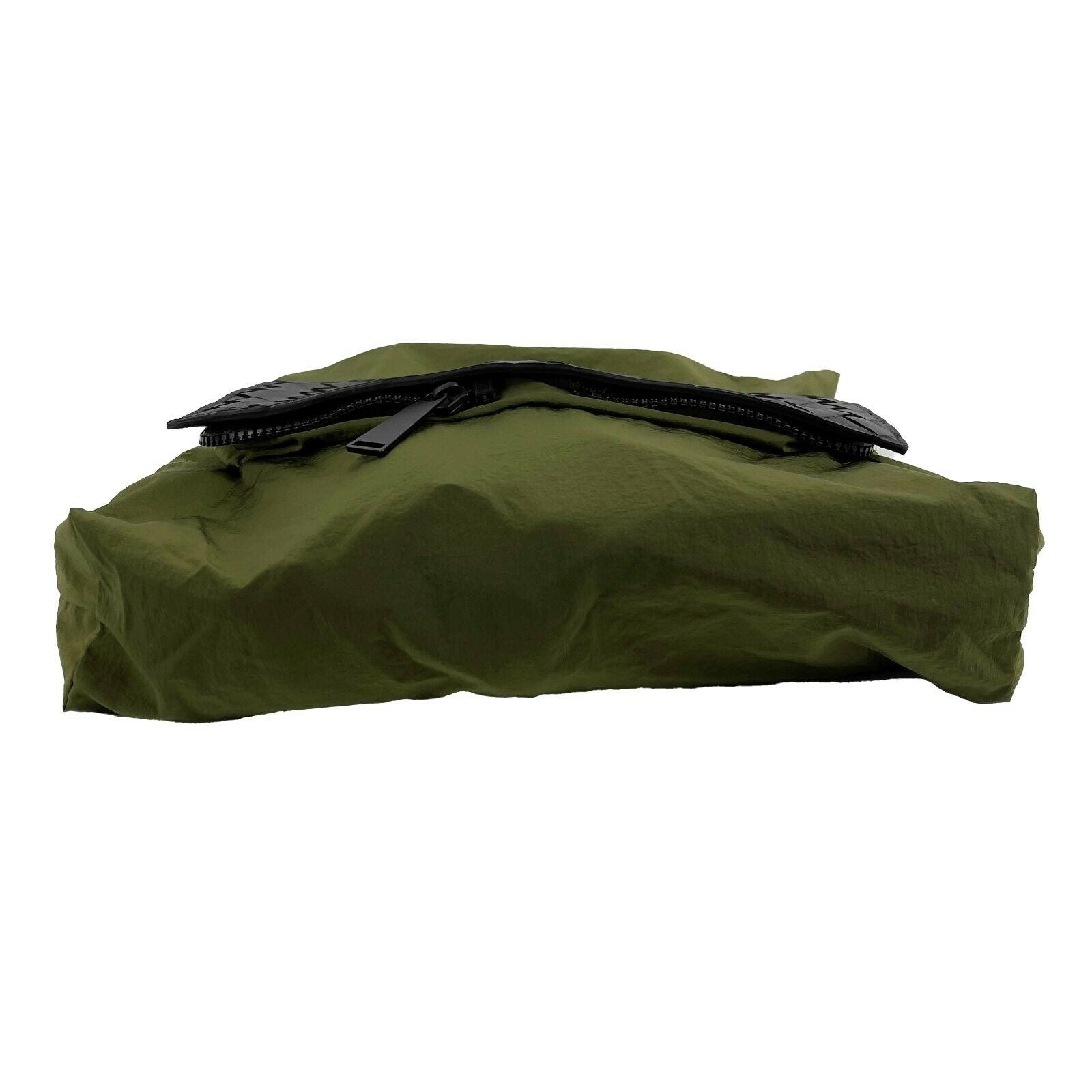* This foldable shopping tote bag is crafted in khaki green nylon with a black nappa leather Bottega Veneta signature woven intrecciato front pocket.