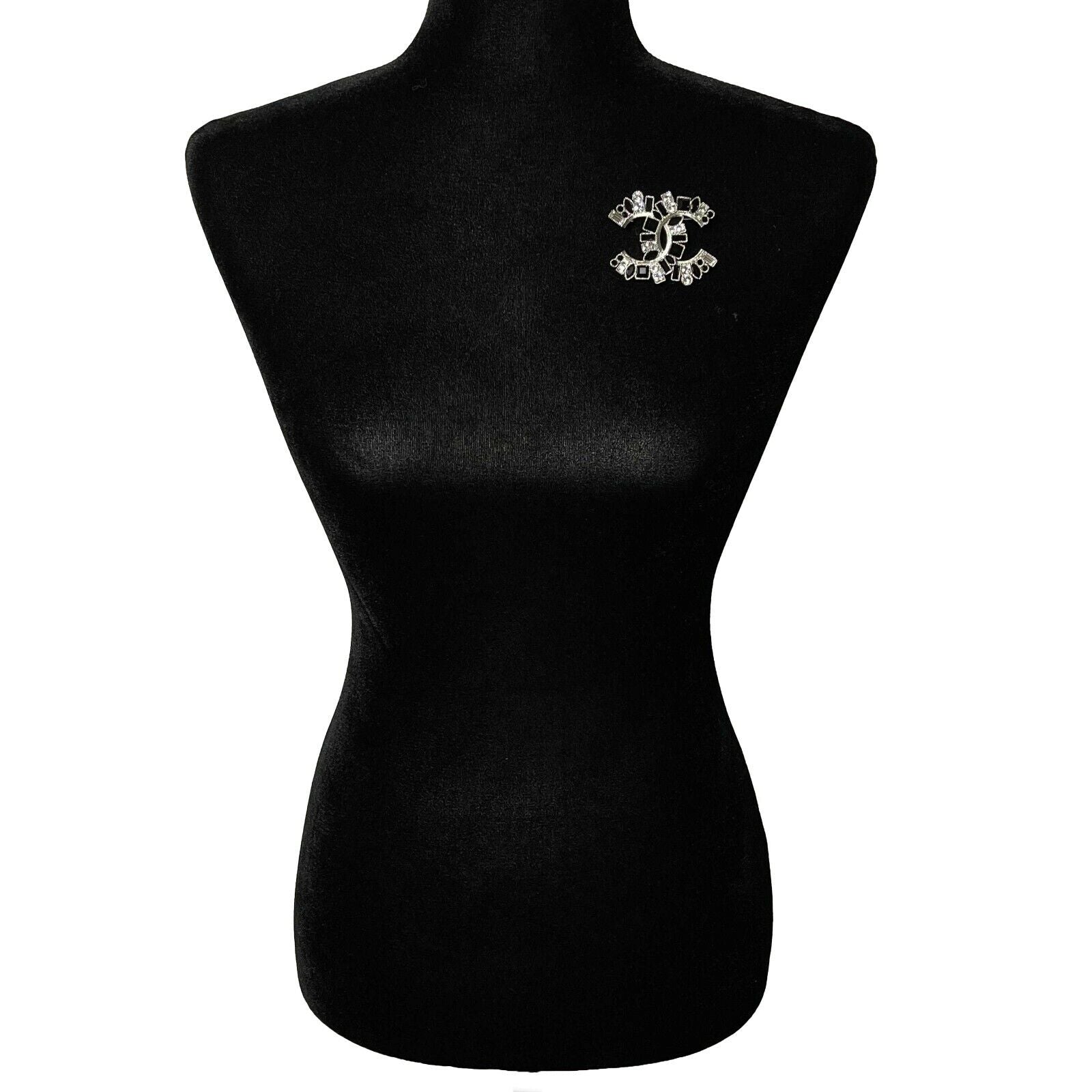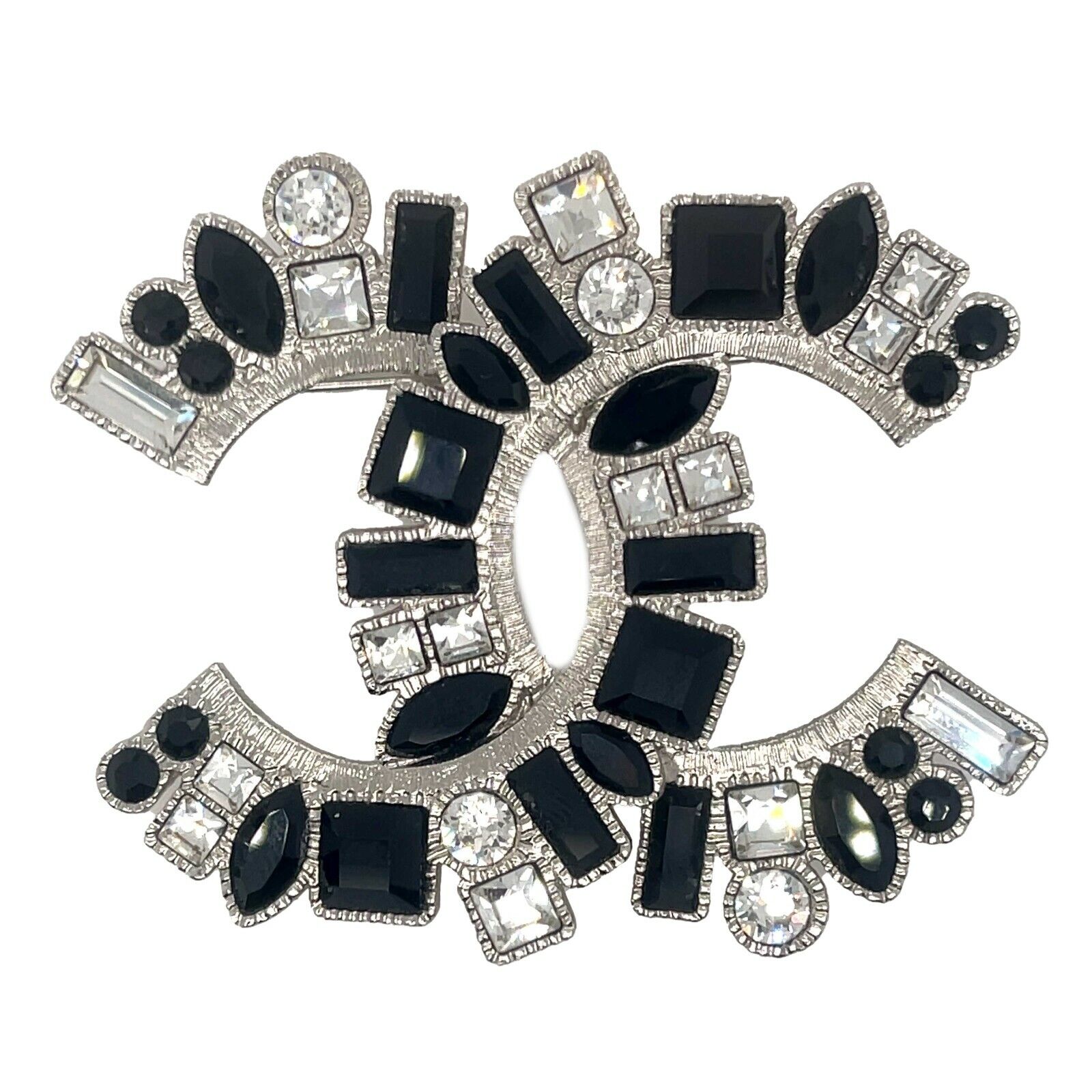 * This Chanel brooch features the iconic interlocking CC logo and is composed of clear and black circular, square, baguette, and marquise cut strass rhinestones.