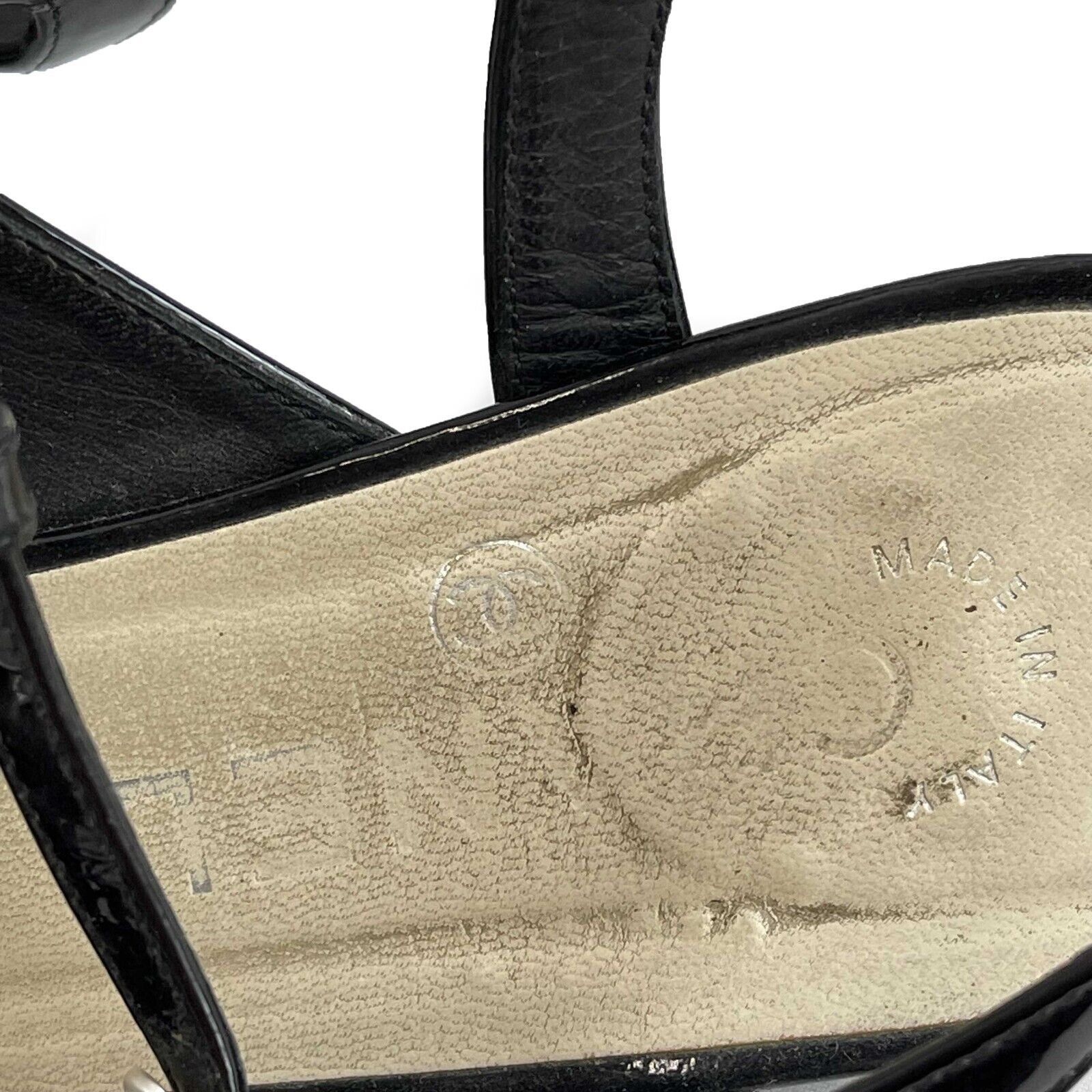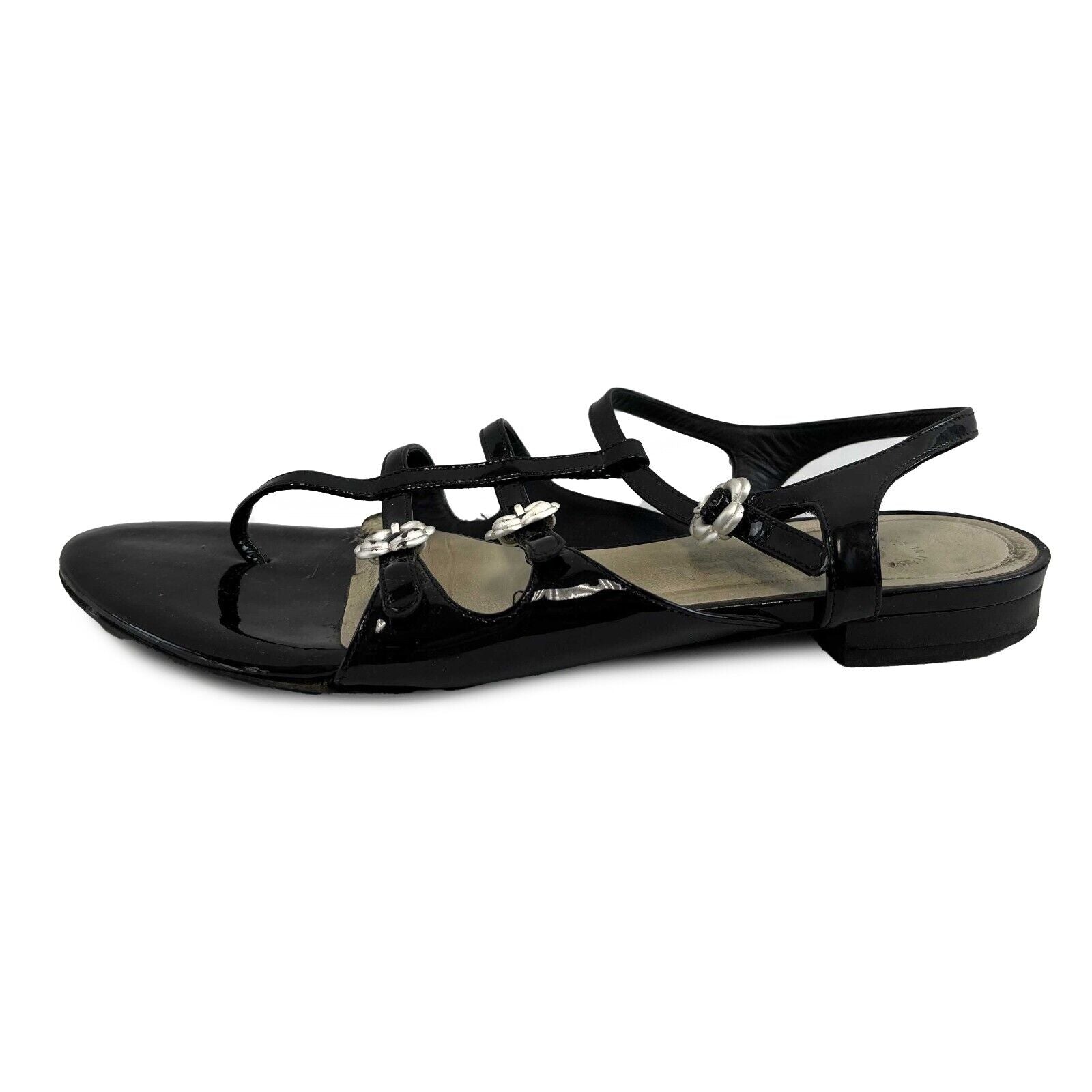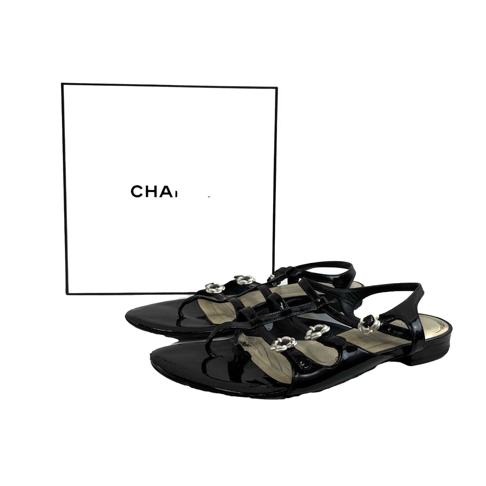 Chanel Black Camellia Flower Accent T Strap Patent Leather Sandals 37 US 7