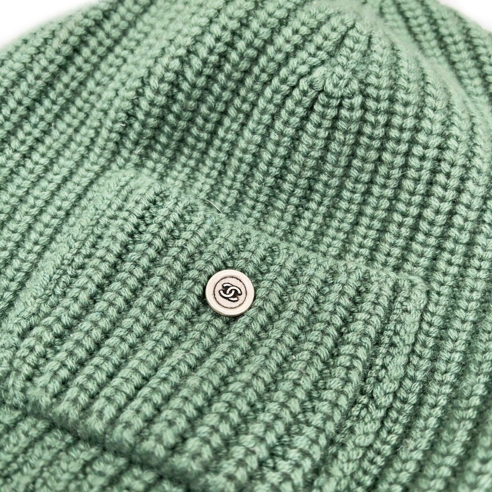 CHANEL - Cashmere Green Beanie - Patch Pocket w/ Silver CC Button - Size XS