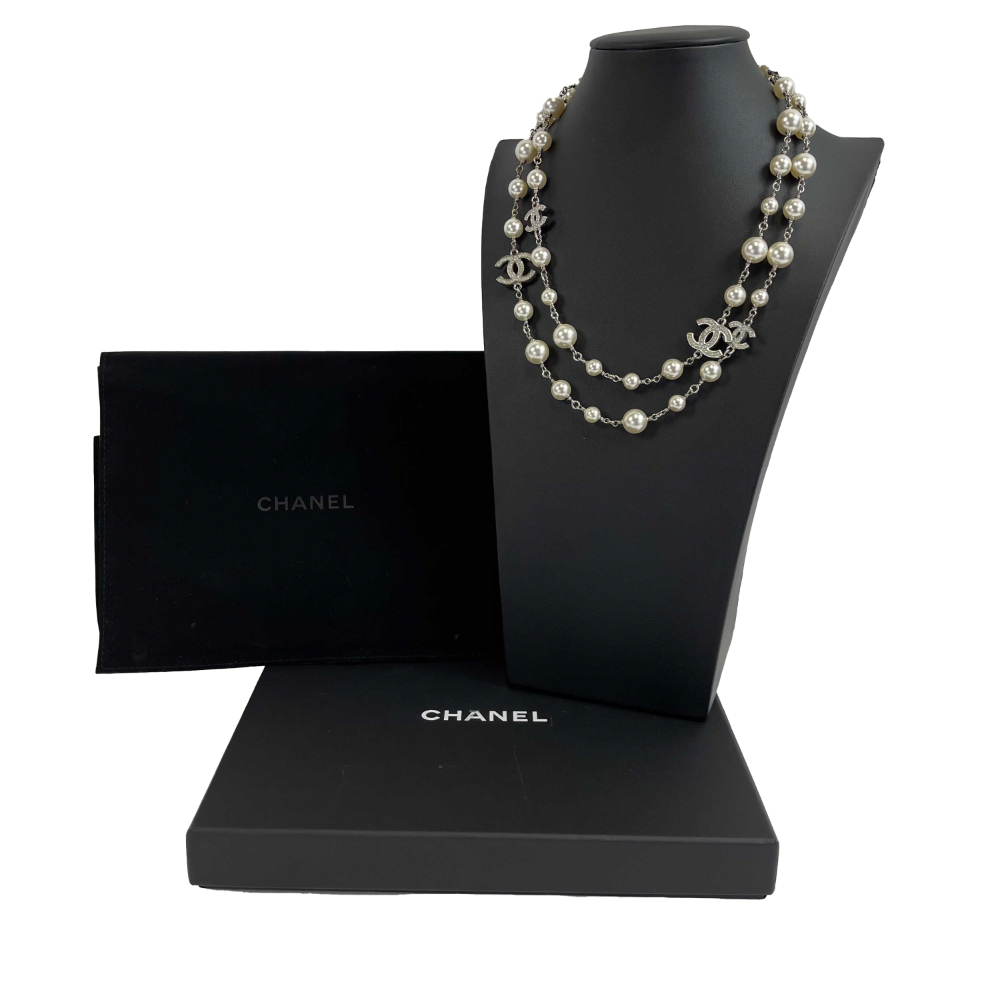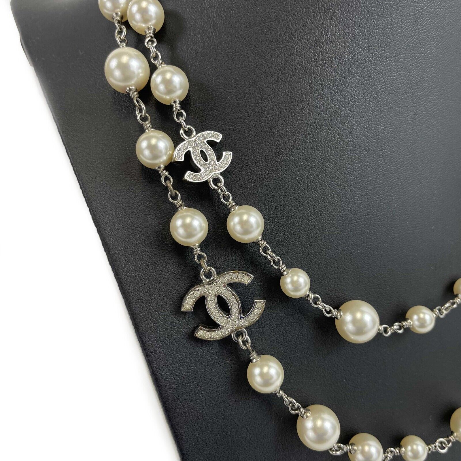 Chanel - Excellent - Designer Chanel Pearl Long Necklace - Silver / White - Necklace