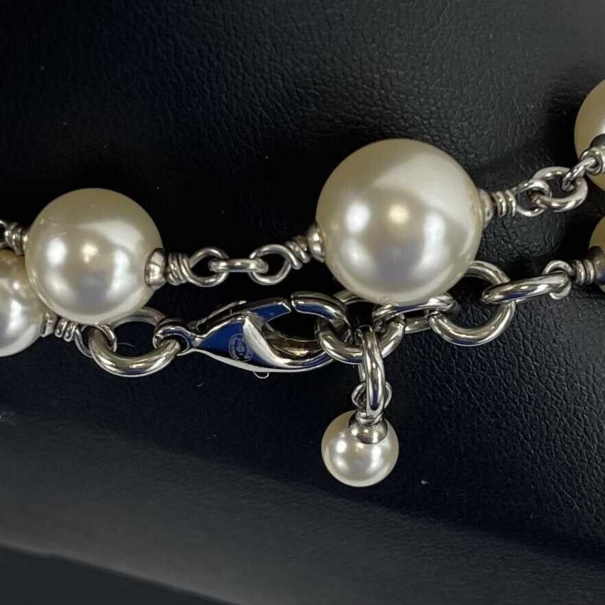 * This Chanel necklace is designed with a silver-toned chain, white faux pearls and the iconic CC logos.