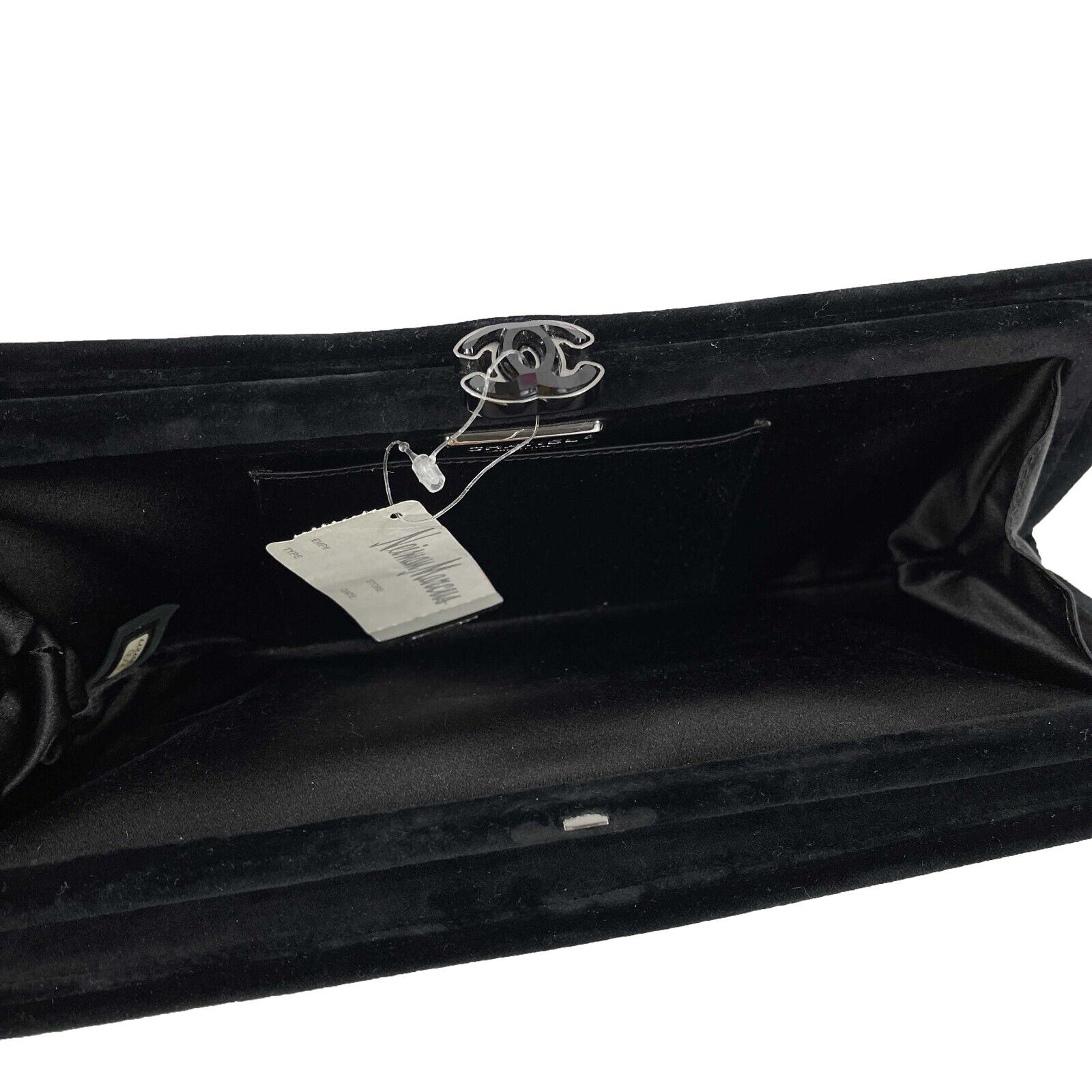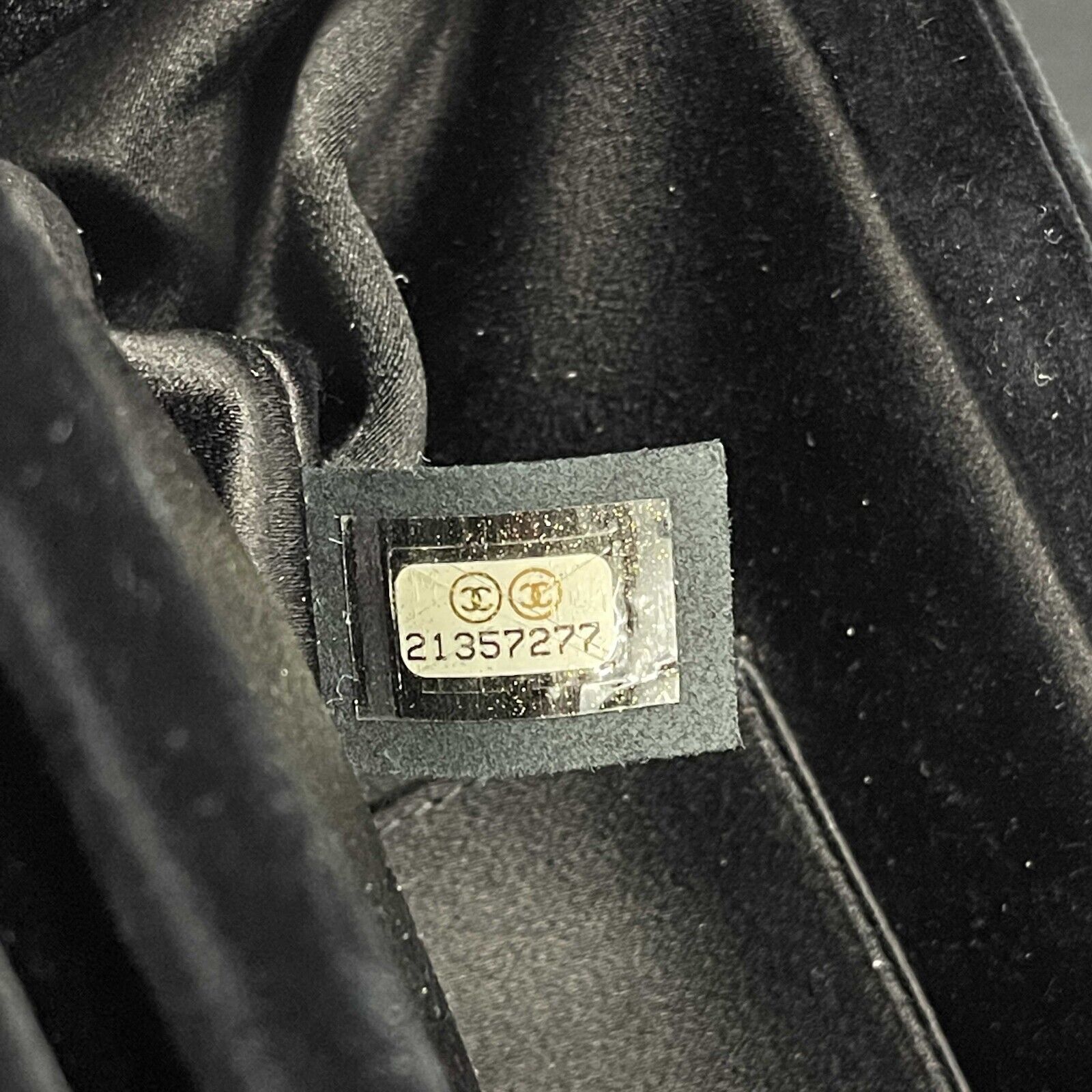 * Opens with a faceted black Chanel CC push lock to a black satin fabric interior with a patch pocket.