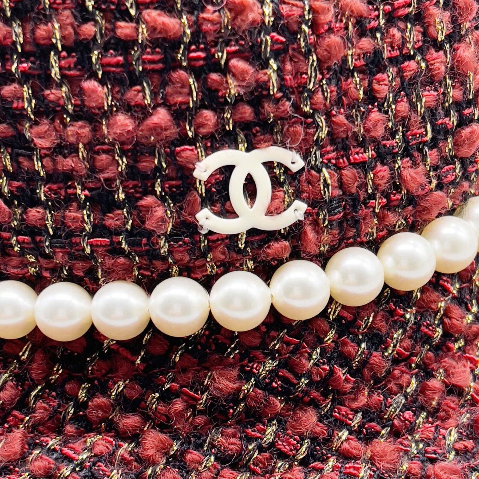 CHANEL - Tweed Boucle Bucket Hat - Pearls / Maroon / CC Logo - Size 57