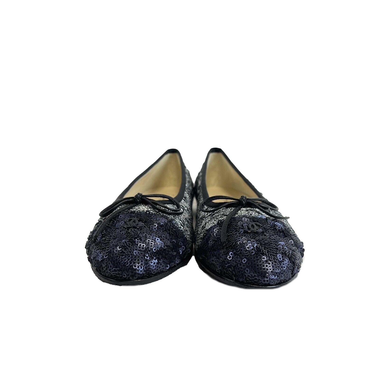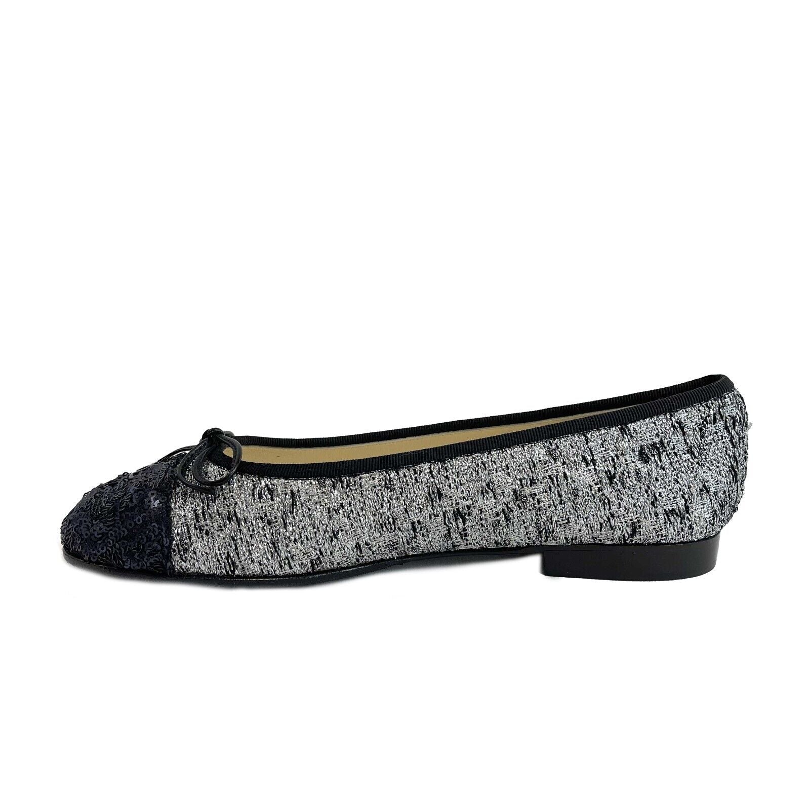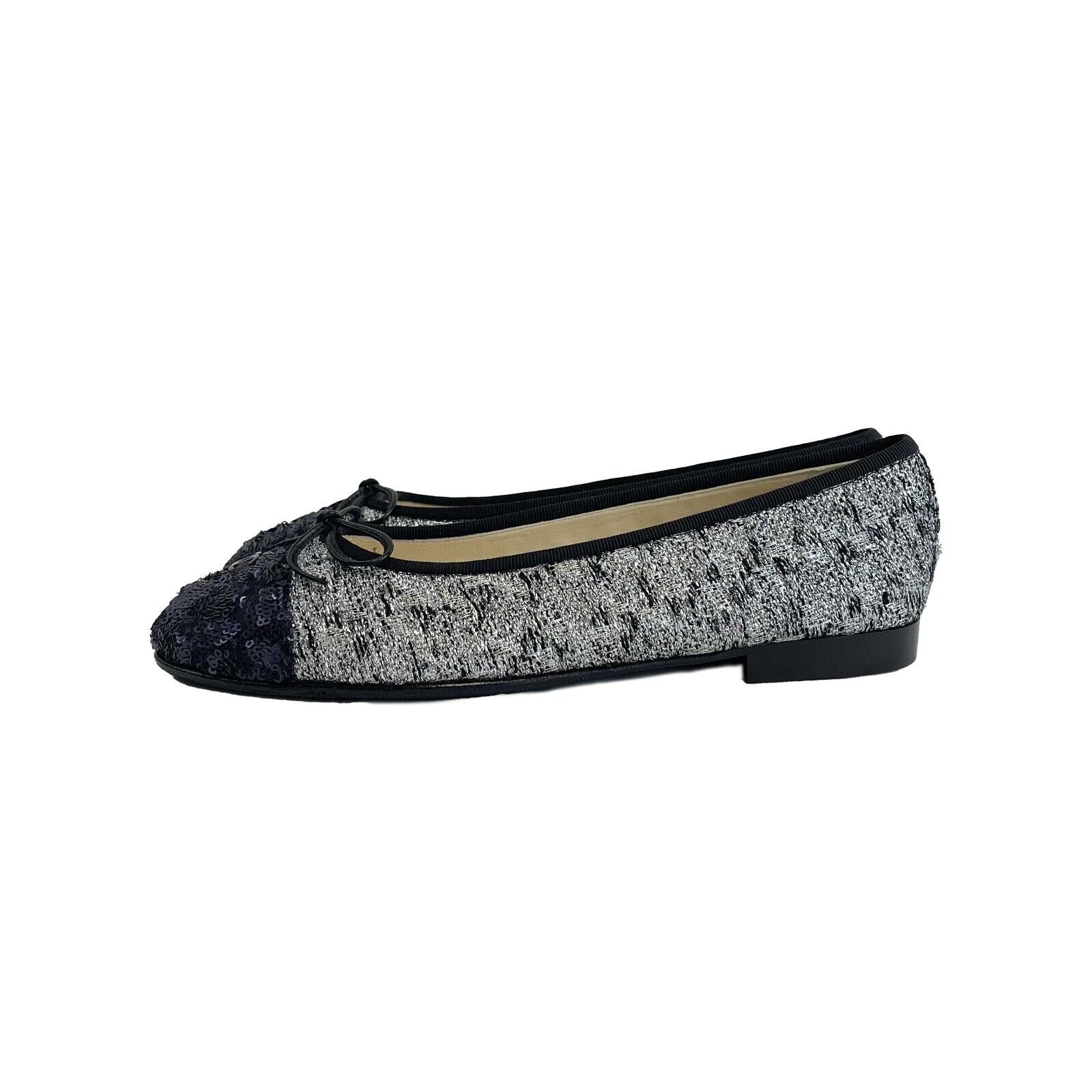 Chanel - New w/o Tags - Tweed Sequin Cap Toe Ballerina Flats - Silver, Black, Blue - 38.5 EUR - 7.5 US - Shoes