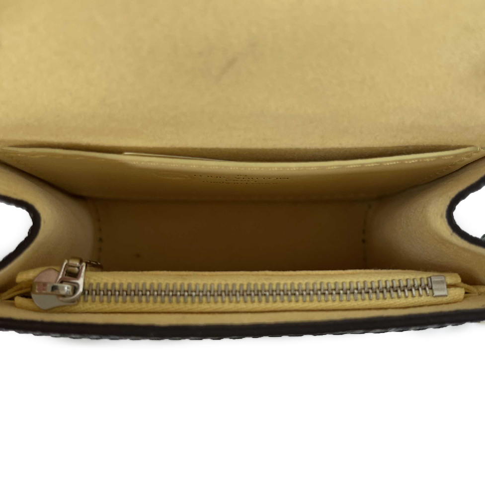 * Flap is trimmed with leather and a decorative silver and blue inlay Louis Vuitton logo clasp.