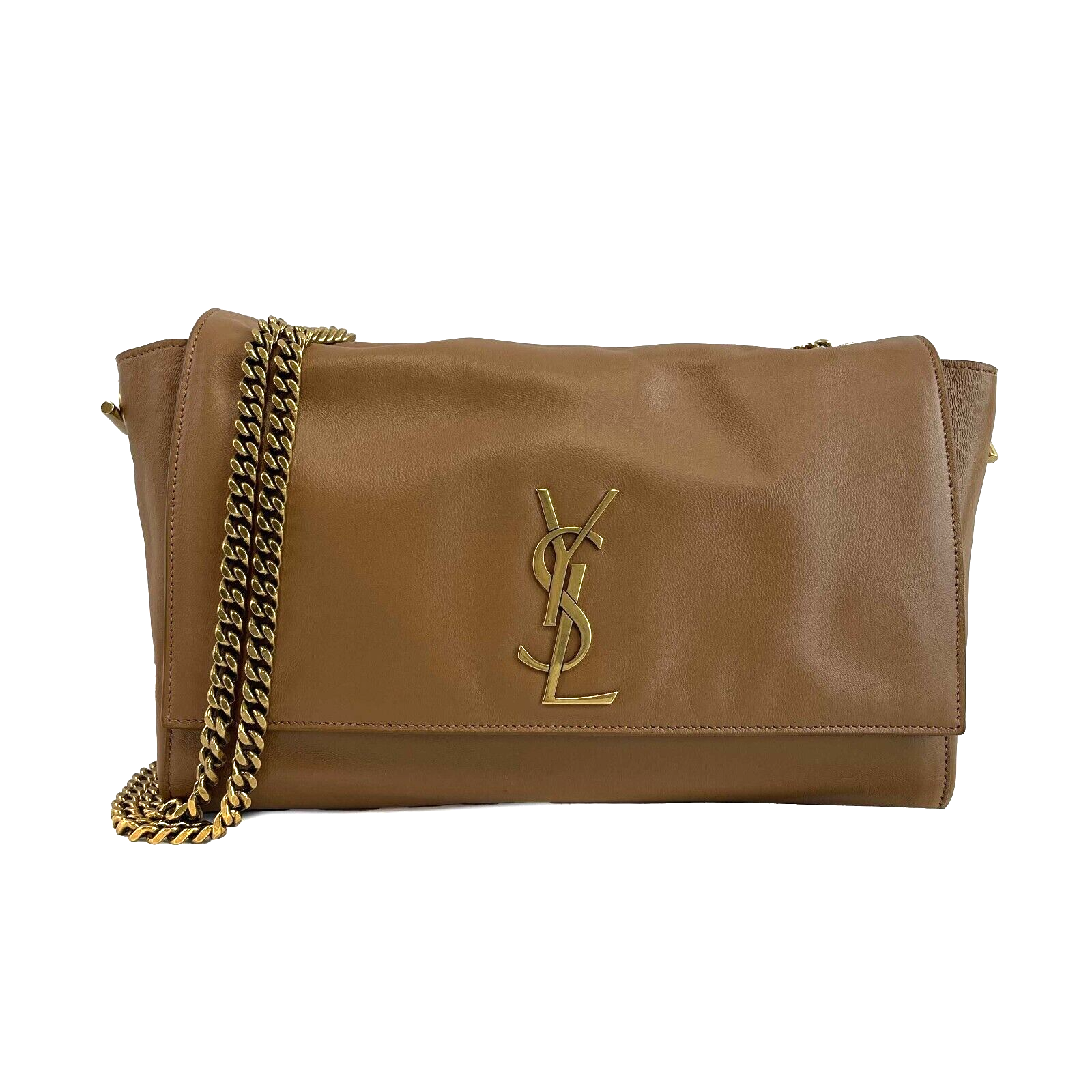 * Flap top with metal YSL monogram; magnetic closure